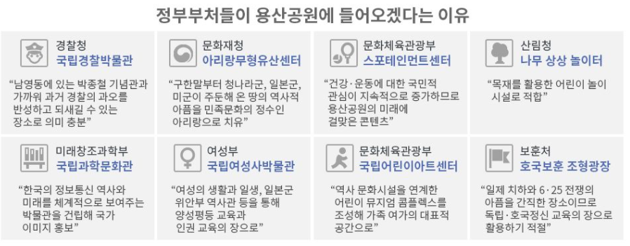대기관 장관, 차관의 관저들과 대기업 회장님들의 사저들이 죄다 여기에 모여있다. 흔히들 고위공무원과 대기업 재벌들이 무조건 강남에서 살고 있을 것으로 잘못 알고 있는 사람들도 많은데, 재벌 3세 이하 고위공무원들 자녀들과 대기업 임원 자녀들이 강남에서 사는 경우가 많고, 진짜 고위공무원들과 대기업 임원들은 강북에서 사는 경우가 많다. 기타 공공기관 공무원들과 대기업 직원들을 위한 관사들도 용산구에 많이 있다. 물론 현실의 공기관 공무원들과 사기업 직원들은 월세가 싸지만 사생활이 강력히 통제되는 관사보다는 월세가 비싸더라도 사생활을 자유롭게 누릴 수 있는 원룸이나 투룸을 마련해서 사는 경우가 압도적으로 많긴 하다.