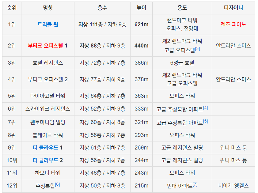지상 111층이 높이 621m짜리 트리플 원 빌딩이 랜드마크 건물로 계획되었으며, 그외에도 200~400m짜리 초고층 건물들의 숲으로 계획되었다. 특히 이 건물은 제1랜드마크 건물이었고, 지상 88층에 높이 440m짜리 부티크 오피스텔 타워가 제2랜드마크로 계획되어 있었다.
